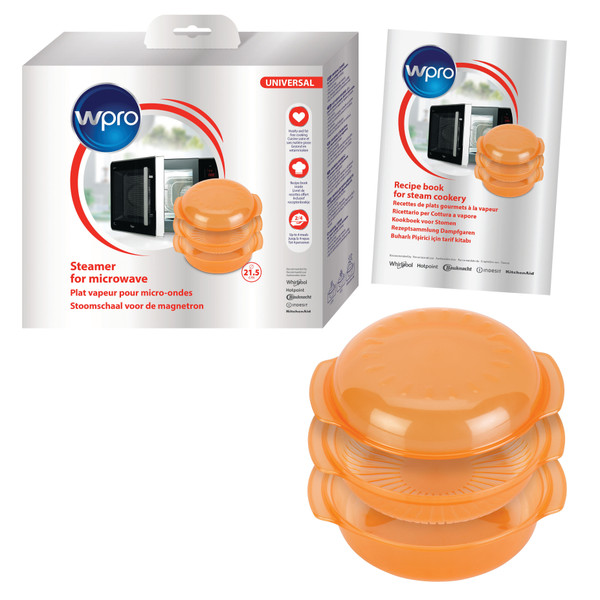Den universelle dampkokeren fra Wpro er ideell for å tilberede grønnsaker, kjøtt og fisk på få minutter ved hjelp av damp i mikrobølgeovnen. Den sørger for at varmen fordeles jevnt, og at dampen sirkulerer optimalt under tilberedningen. Dampkokeren består av en rund tallerken, en dampkurv og et lokk, og du får også et oppskriftshefte med på kjøpet. Kan vaskes i oppvaskmaskin og er BPA-fri. Mål: Ø 21,4 cm.