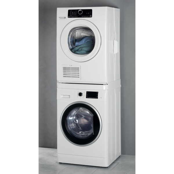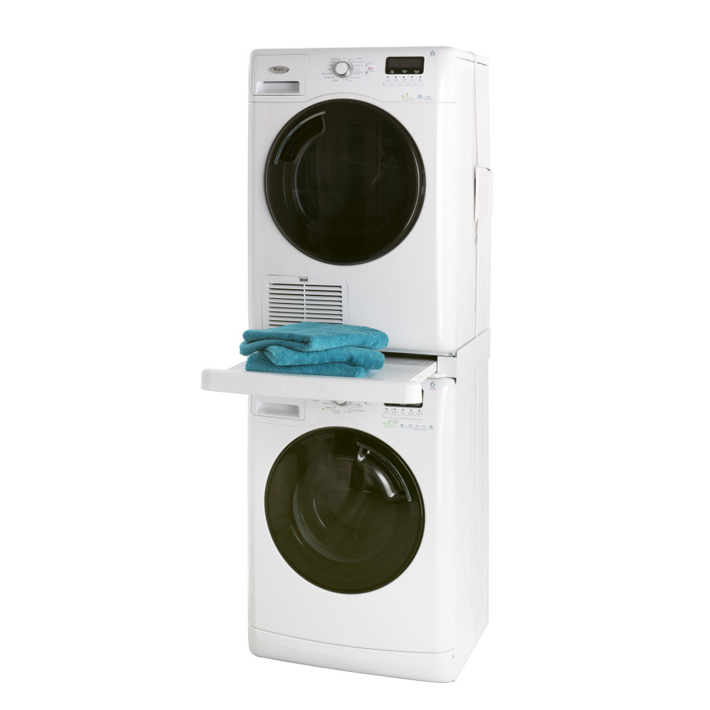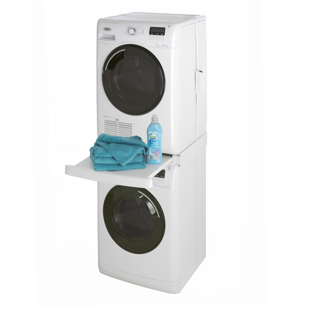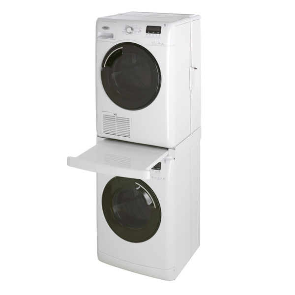Den universelle stablerammen fra Wpro er en perfekt løsning for å spare plass på vaskerommet. Den høye kvaliteten og robuste strukturen gjør det mulig å plassere tørketrommelen helt trygt oppå vaskemaskinen. Stablerammen monteres enkelt uten verktøy og er velegnet for alle maskiner på 60 x 60 cm. For å stabilisere monteringen leveres stablerammen med et belte som festes rundt de to maskinene. Den praktiske uttrekkbare hyllen tåler opptil 10 kg og gjør at du kan legge inn, ta ut og brette sammen tøy uten å måtte bøye deg. Settet inneholder følgende: 8 selvklebende gummistykker for antiskli, 4 stive plastplater, 1 «safe-in-lock»®-belte med strammer og 1 beltedeksel.